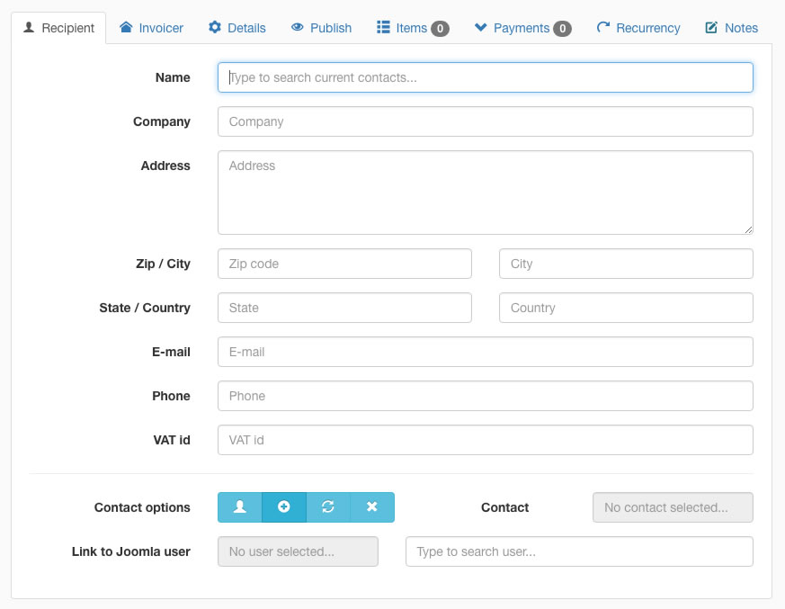 The first thing you'll see on creating a new invoice is the Contact ("Recipient") form: